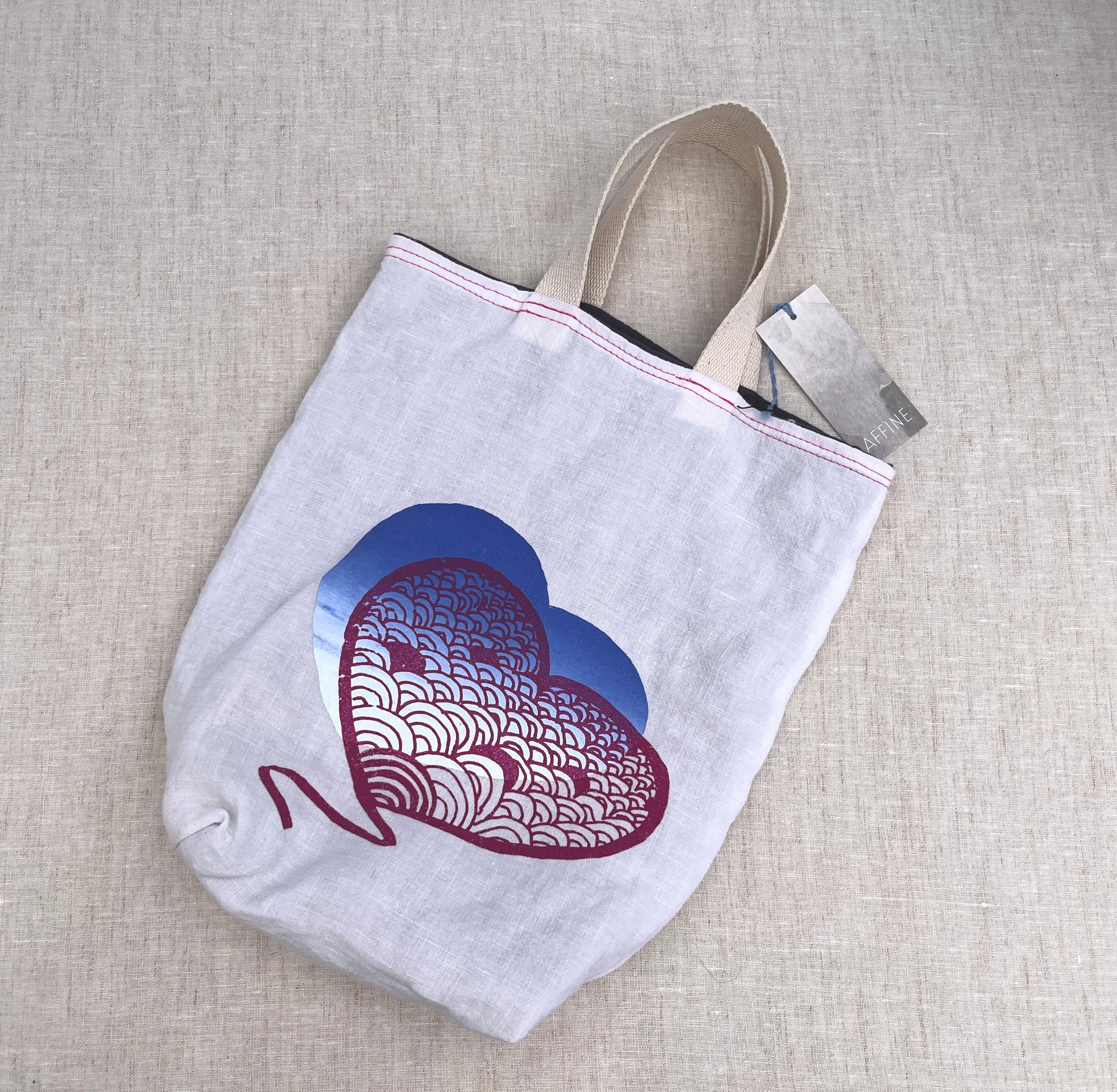 This tiny bag is perfect to fit a pair ballet slippers or dance shoes. Simple with no pockets or closures. White screen printed 100% linen with a heart wave design. Lined with a grey 100% organic cotton double gauze.